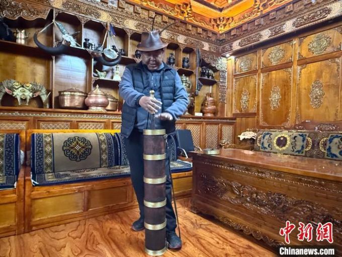 图为米玛顿珠在展示传统的酥油桶。贡桑旺姆 摄